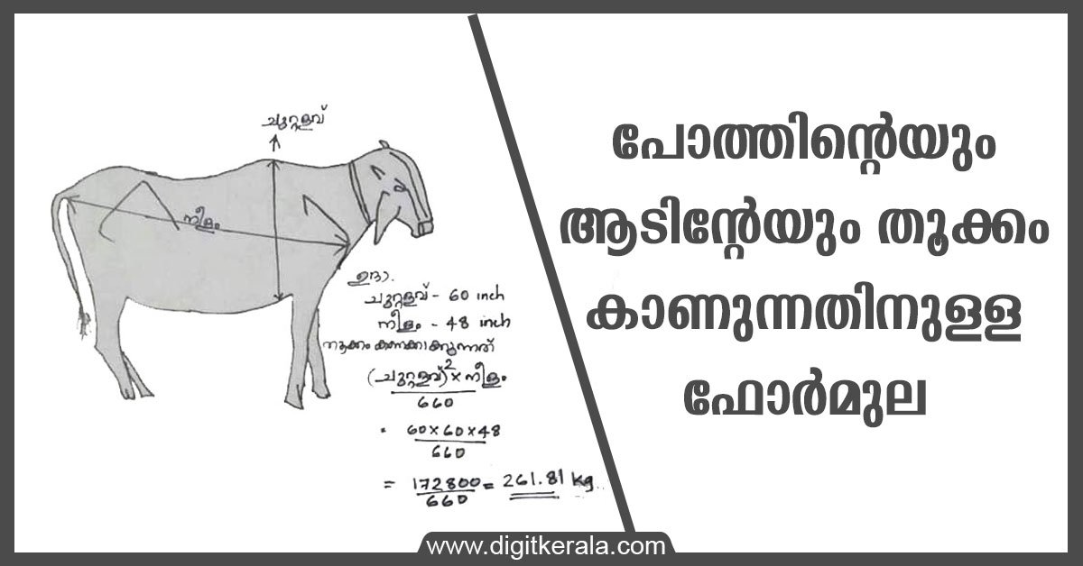 ഒരു ഉദാഹരണം എടുത്ത് പരിശോധിക്കുകയാണെങ്കിൽ മൃഗത്തിന്റെ ചുറ്റളവ് 60 ഇഞ്ച്, നീളം 48 ഇഞ്ച് ഇങ്ങനെയാണ് ഉള്ളത് എങ്കിൽ തൂക്കം കണക്കാക്കുന്നതിനായി ചെയ്യേണ്ട രീതി.