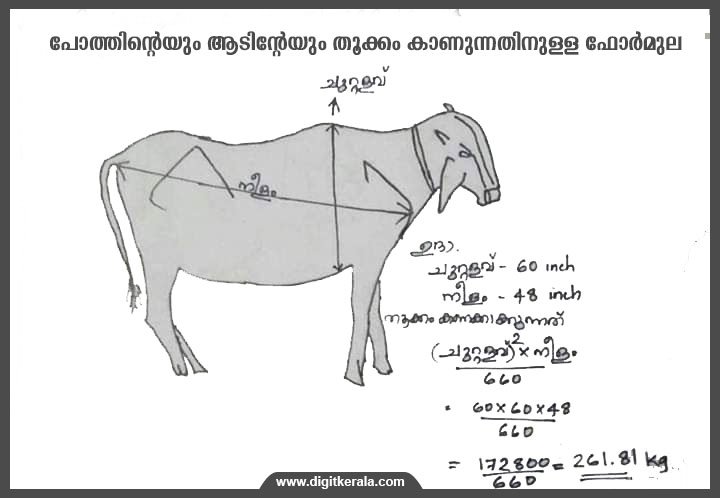 മൃഗത്തിന്റെ തൂക്കം =60*60*48/660=261.81kg എന്ന കണക്കിൽ ആയിരിക്കും.